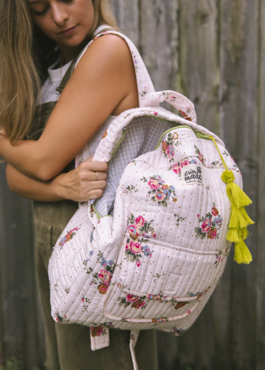 Soft quilted backpack with a contrast print. Front pocket and a slouchy silhouette makes this practical and comfortable.