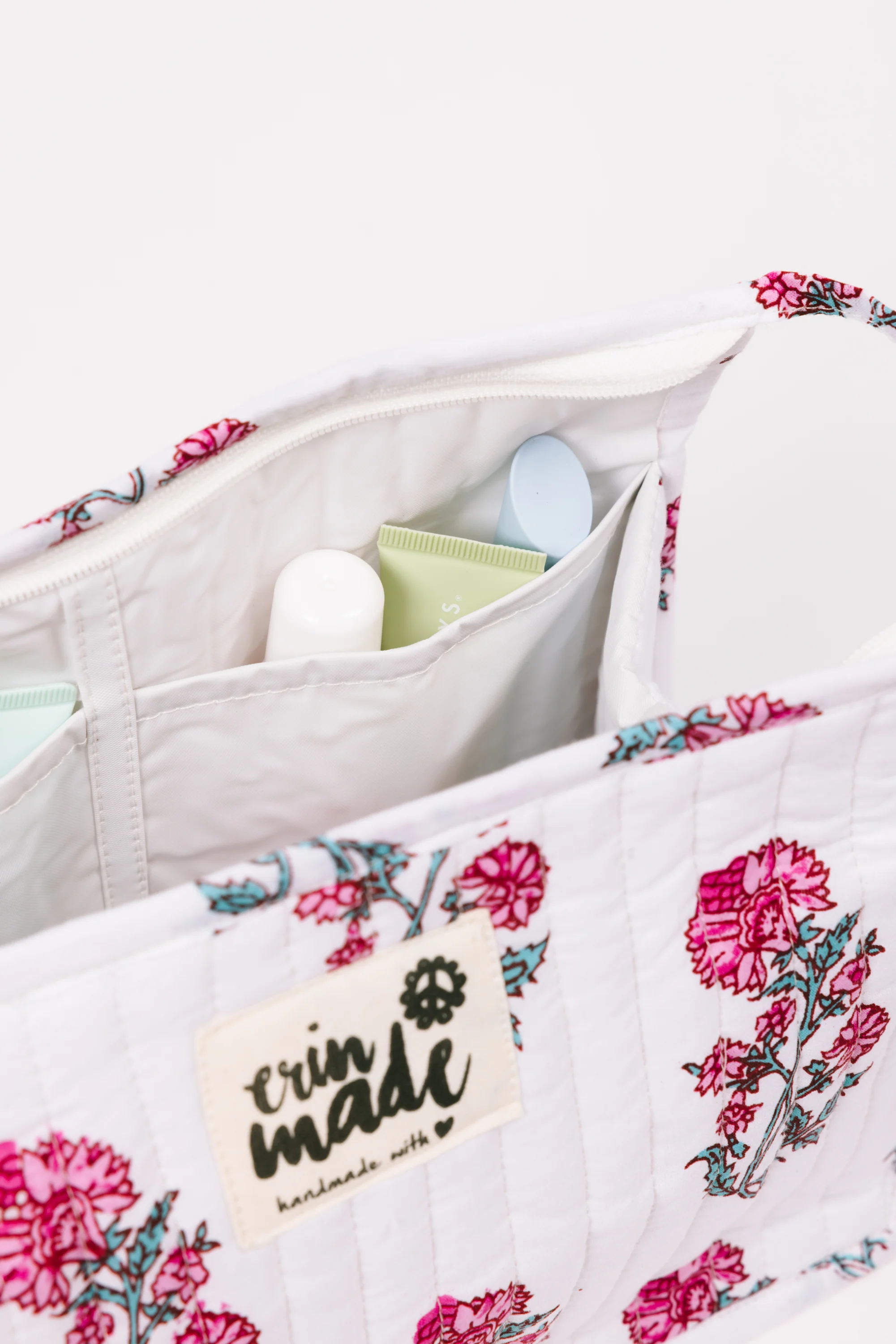 The Cosmetic Case is quilted, soft and compact, with interior lining and two pockets. Zip closure at top. Outer shell is 100% cotton.