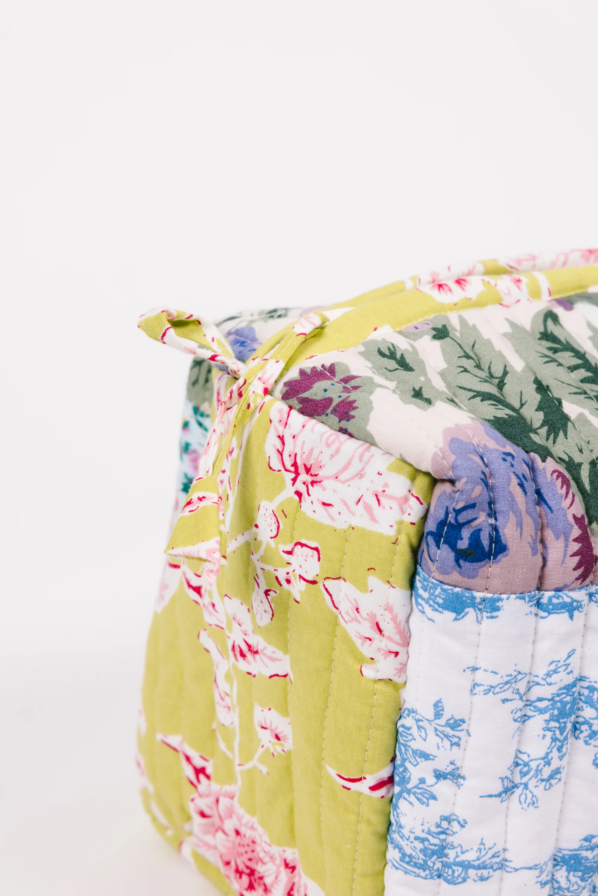Pouch is soft and compact, in our signature Sadie patchwork, with interior fabric lining and four pockets. Zip closure at top.
