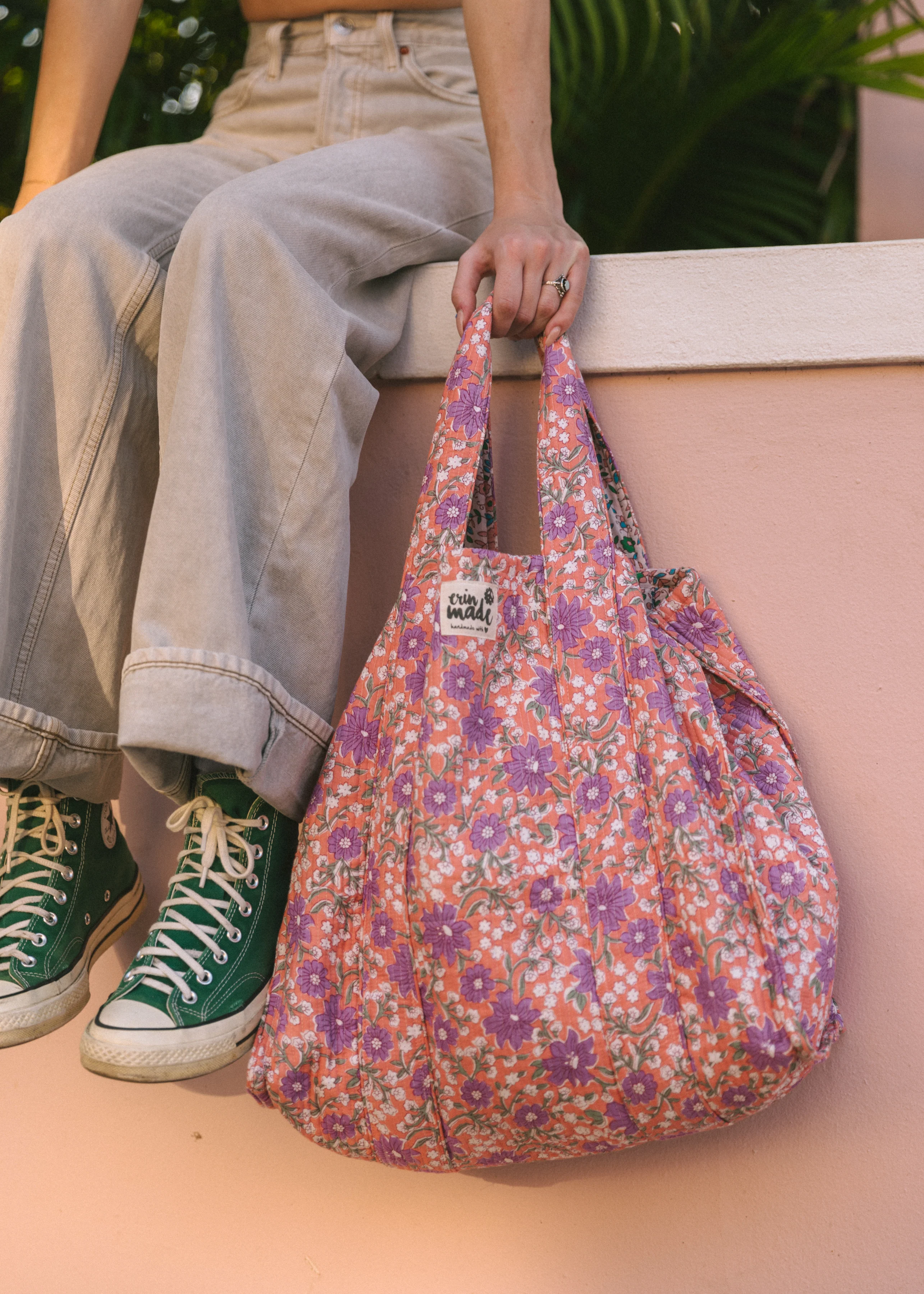 Structured, Over-Sized, Reversible Tote. Perfect for the farmers market, Target run, library score, weekend getaway, or day at the beach! Soft, but sturdy, the Erin Made quilted fabric adds heft to handle life's bigger carries.