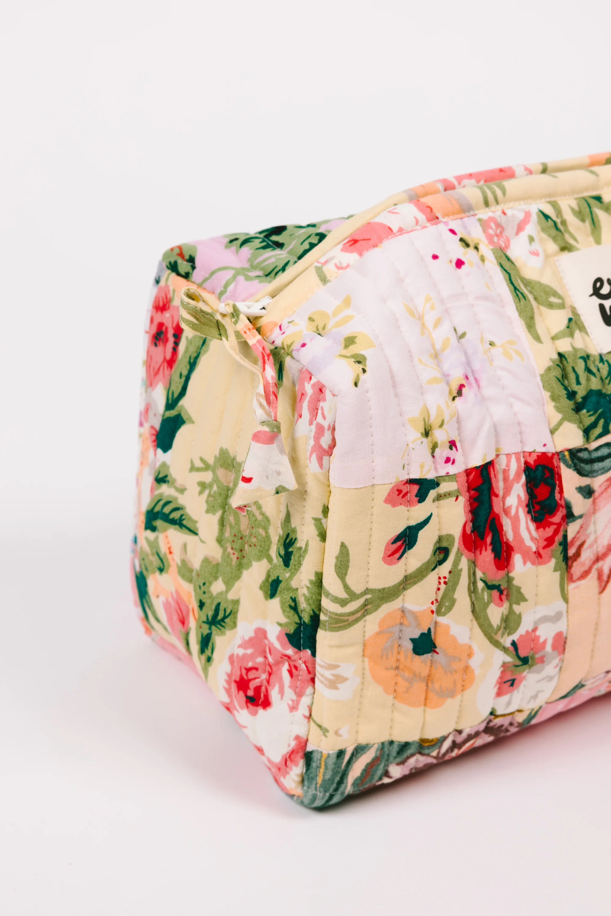Pouch is soft and compact, in our signature Isabelle patchwork, with interior fabric lining and four pockets. Zip closure at top.