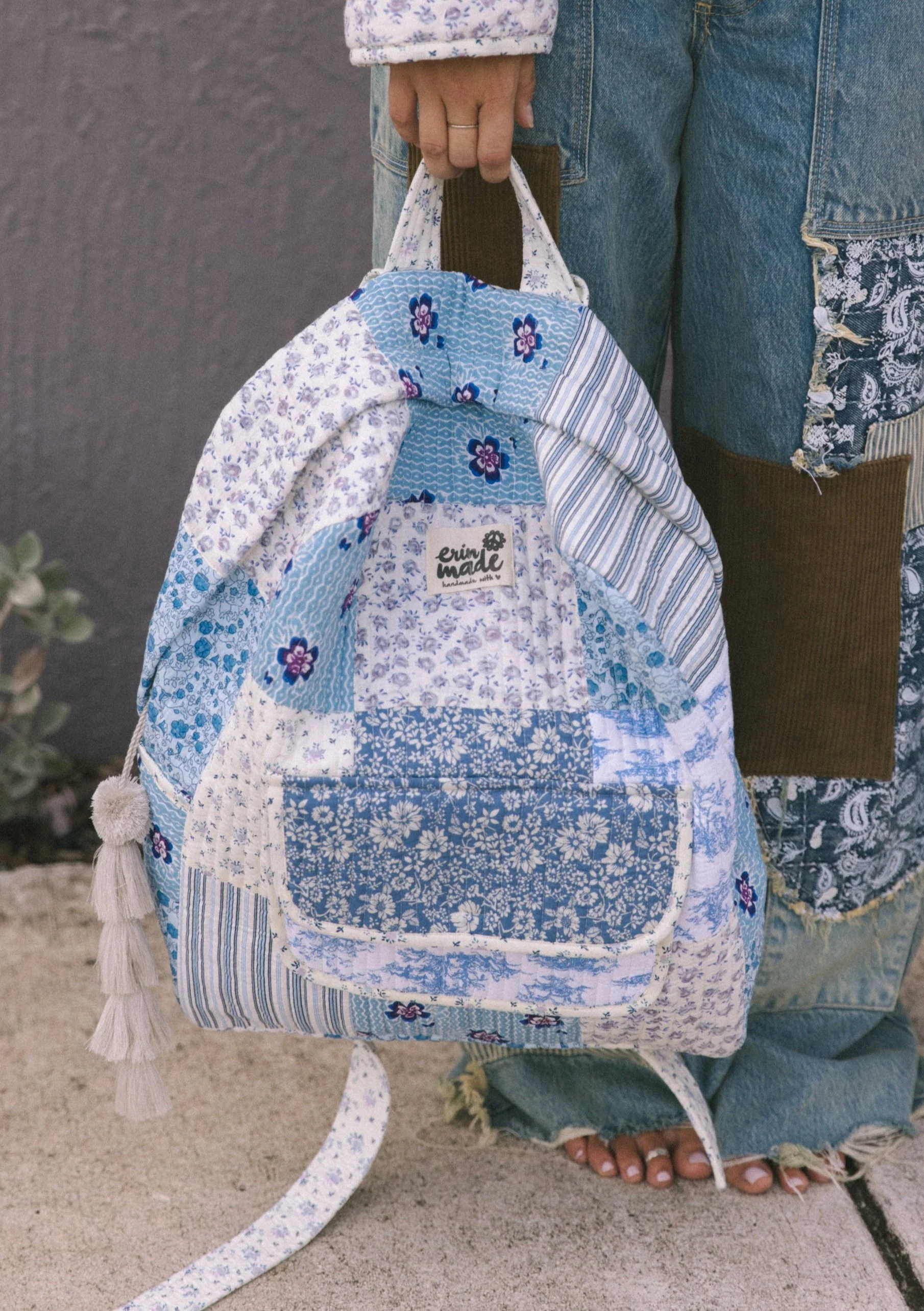 Soft quilted backpack in our signature Quinn Patchwork. Front pocket and a slouchy silhouette makes this practical and comfortable.