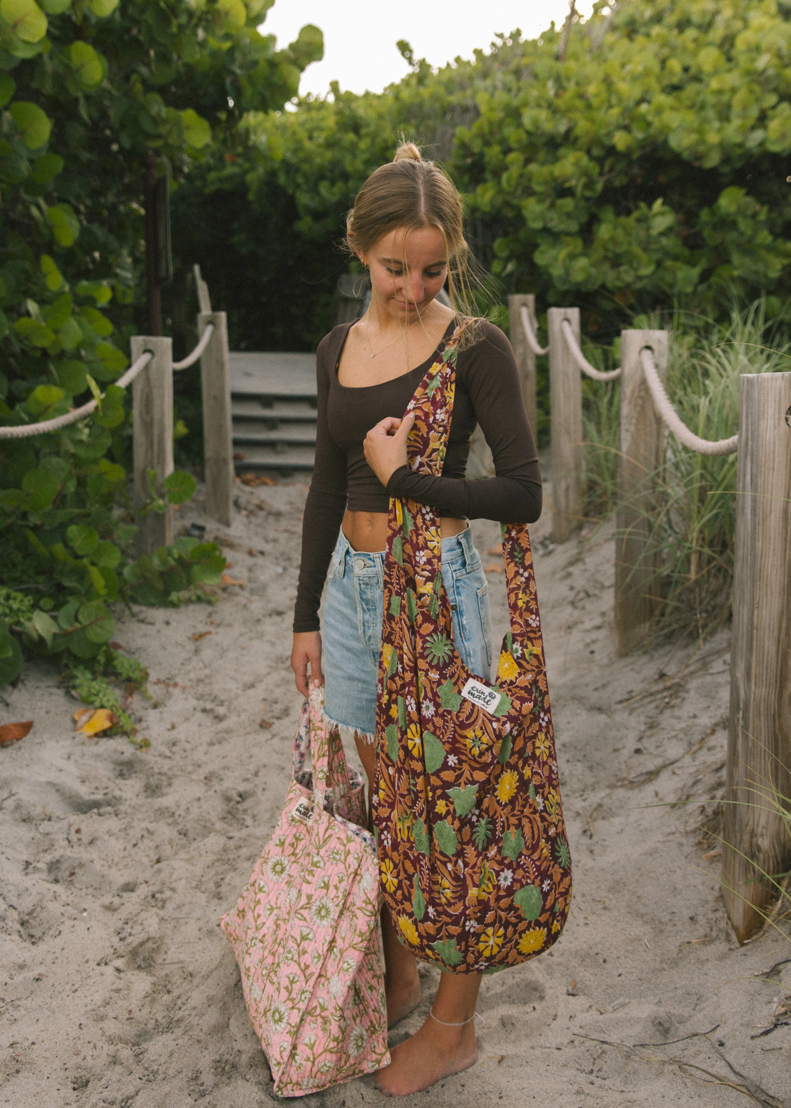 Shoulder or cross-body unlined carryall, packs up light essentials in style. A perfect easy, breezy bag made out of hand block printed cotton fabric.